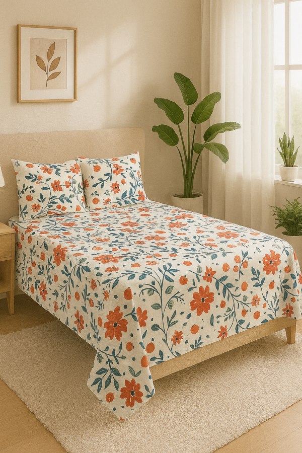 Bring floral charm to your bedroom with this peach blossom cotton bedsheet.