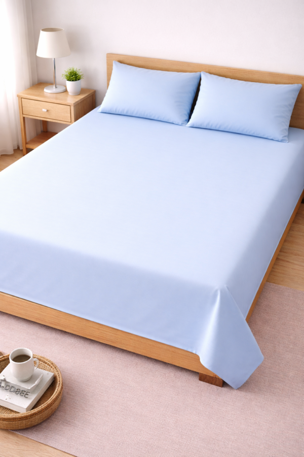 Blue botanical printed bedsheet with white leaf patterns in a bright bedroom.