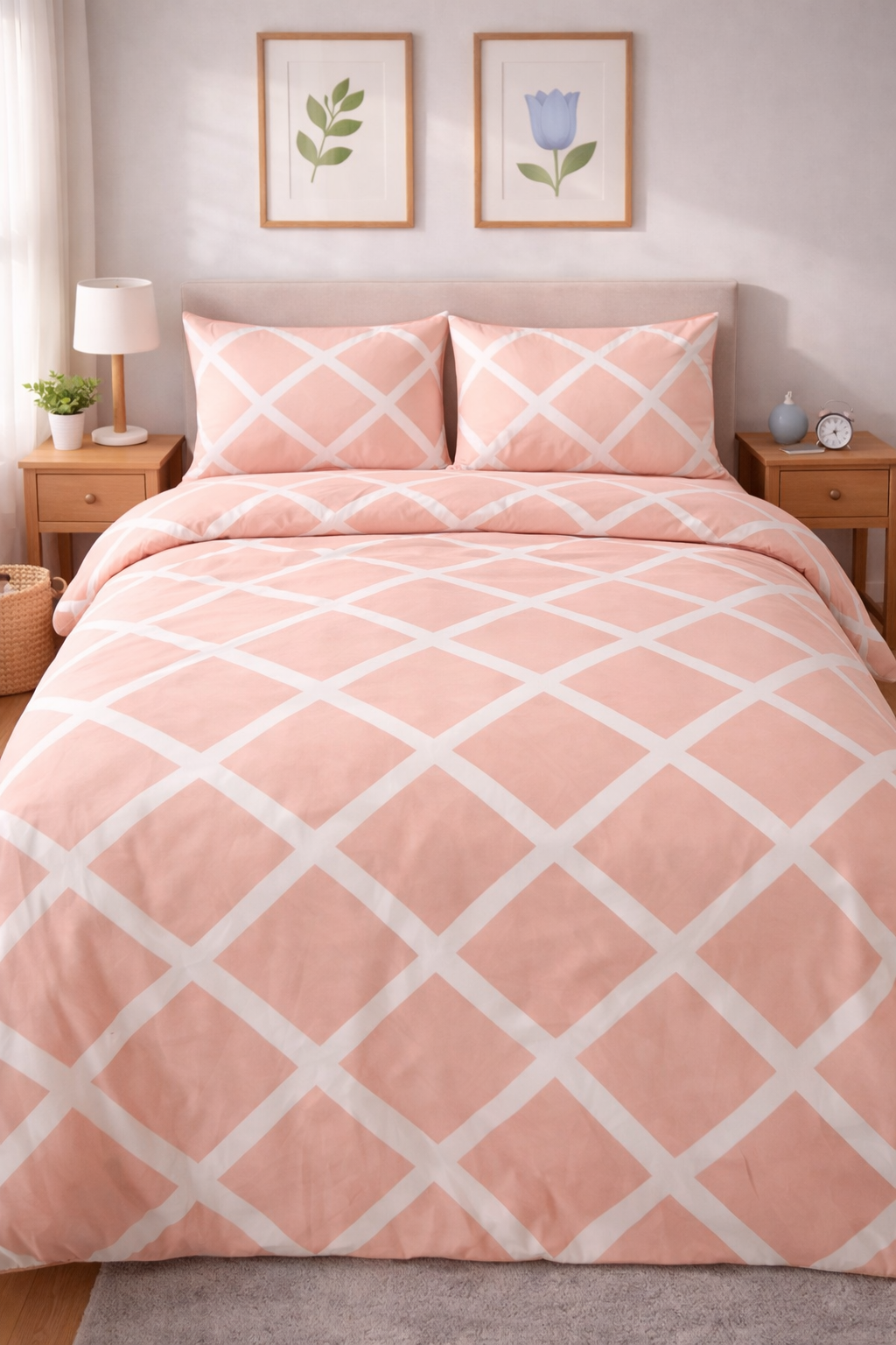 Soft peach tones with a clean lattice pattern bring calm elegance to your bedroom.Designed for everyday comfort with a smooth, breathable finish.Perfect for minimal, modern interiors.