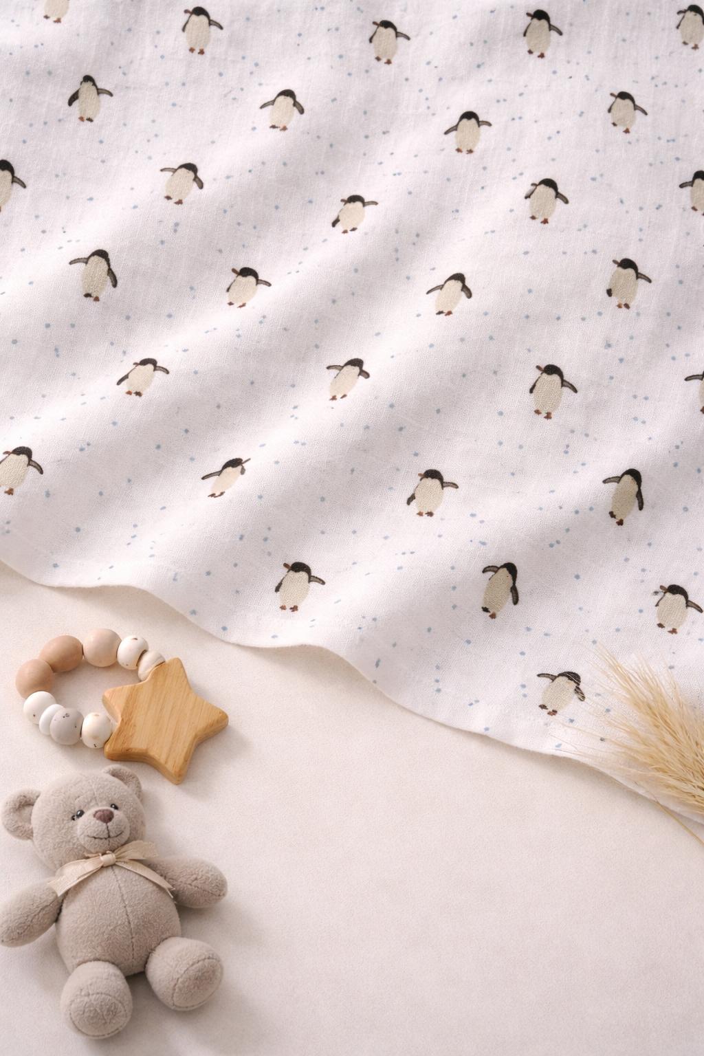 Wrap your baby in cloud-like softness with this penguin print muslin swaddle. Crafted from breathable cotton fabric, it ensures comfort in every season.