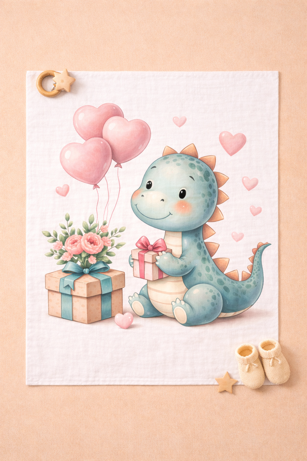 Wrap your baby in warmth and love with the Sweetheart Dino Muslin Swaddle. Featuring a cute dinosaur holding a gift and floating heart balloons, this design adds a loving touch to everyday essentials.