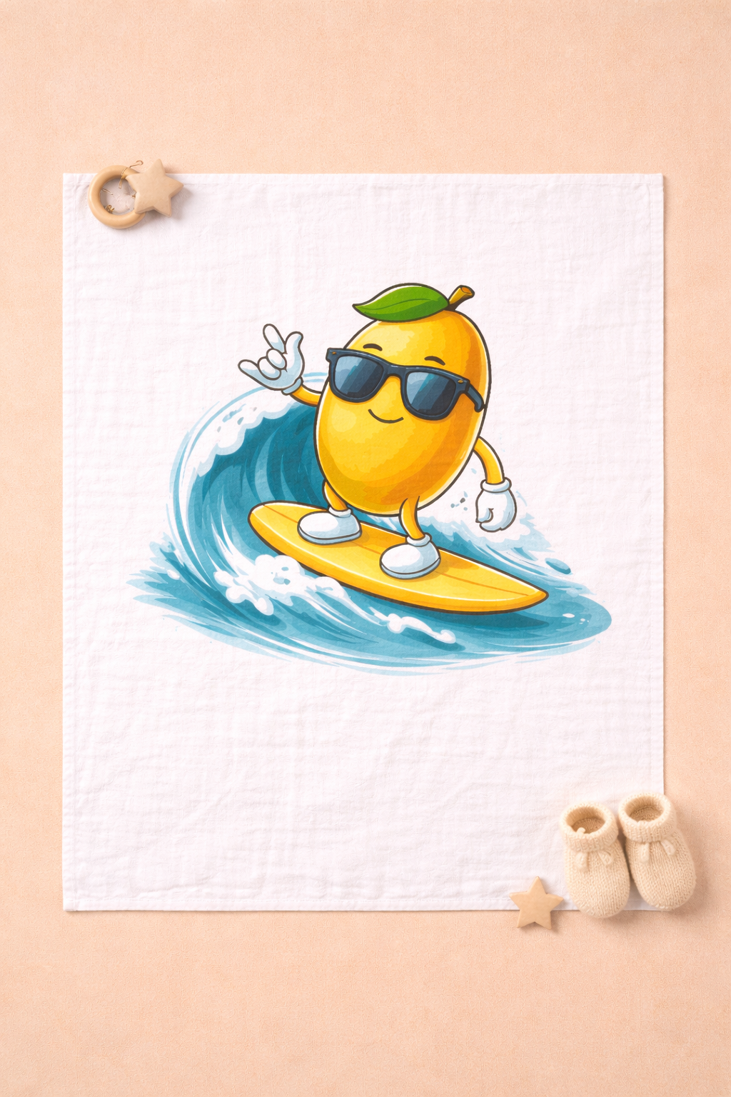 Bring summer vibes to your baby’s essentials with the Tropical Surf Muslin Swaddle. Featuring a fun mango character surfing the waves, this soft muslin wrap adds playful energy to everyday cuddles.